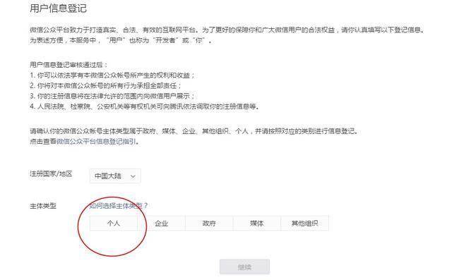 6、激活后,選擇用戶信息主體類型個人需要注意的是個人類型暫不支持微信認證、微信支付功能。企業主體信息提交后不可更改。