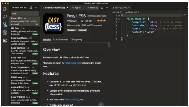 在開發微信小程序時,寫css會比較麻煩,效率不高,最好的辦法就是使用less或者sass,可以使用gulp等配置編譯,但是使用此法又略顯麻煩,最好的辦法就是使用Vscode裝一個less轉wxss插件, Easy LESS