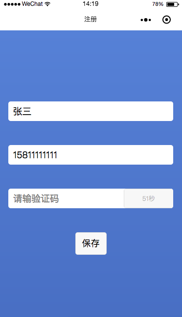 微信小程序注冊完整實(shí)例,發(fā)送短信驗證碼,帶60秒倒計時功能,無需服務(wù)器端。效果圖: